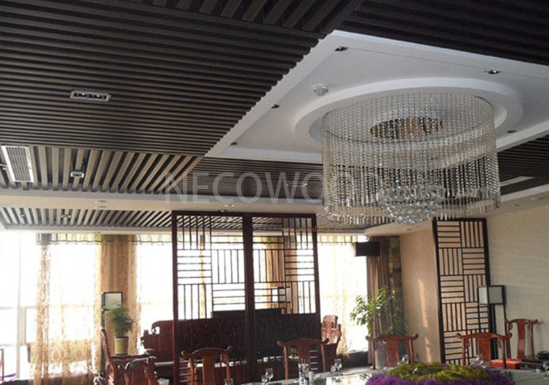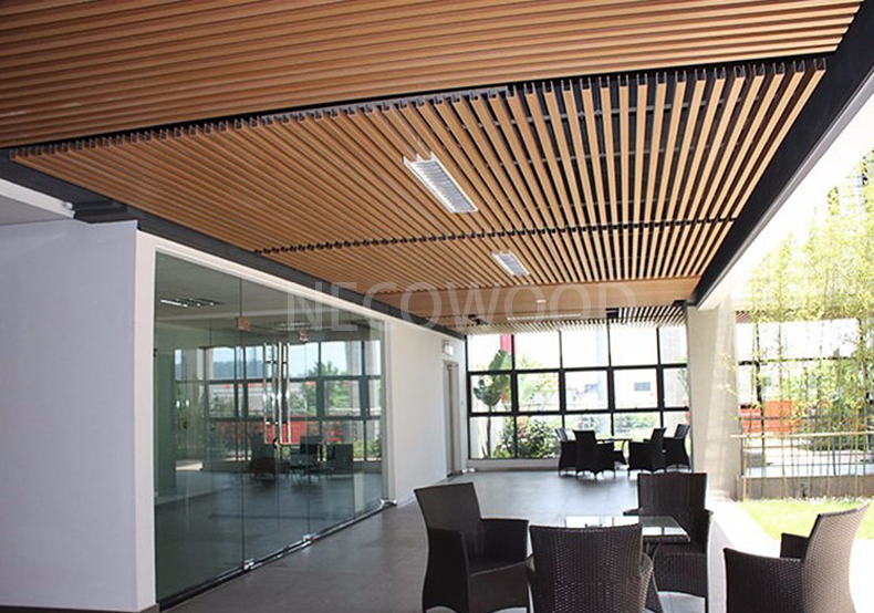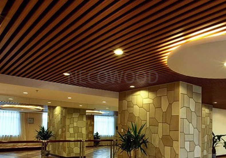 Потолочные панели Necowood, изготовленные из древесно-пластикового композита (ДПК) — смеси натуральных древесных волокон и высококачественных полимеров, передают тепло и красоту настоящего дерева, устраняя при этом такие проблемы, как коробление, растрескивание или частый уход.